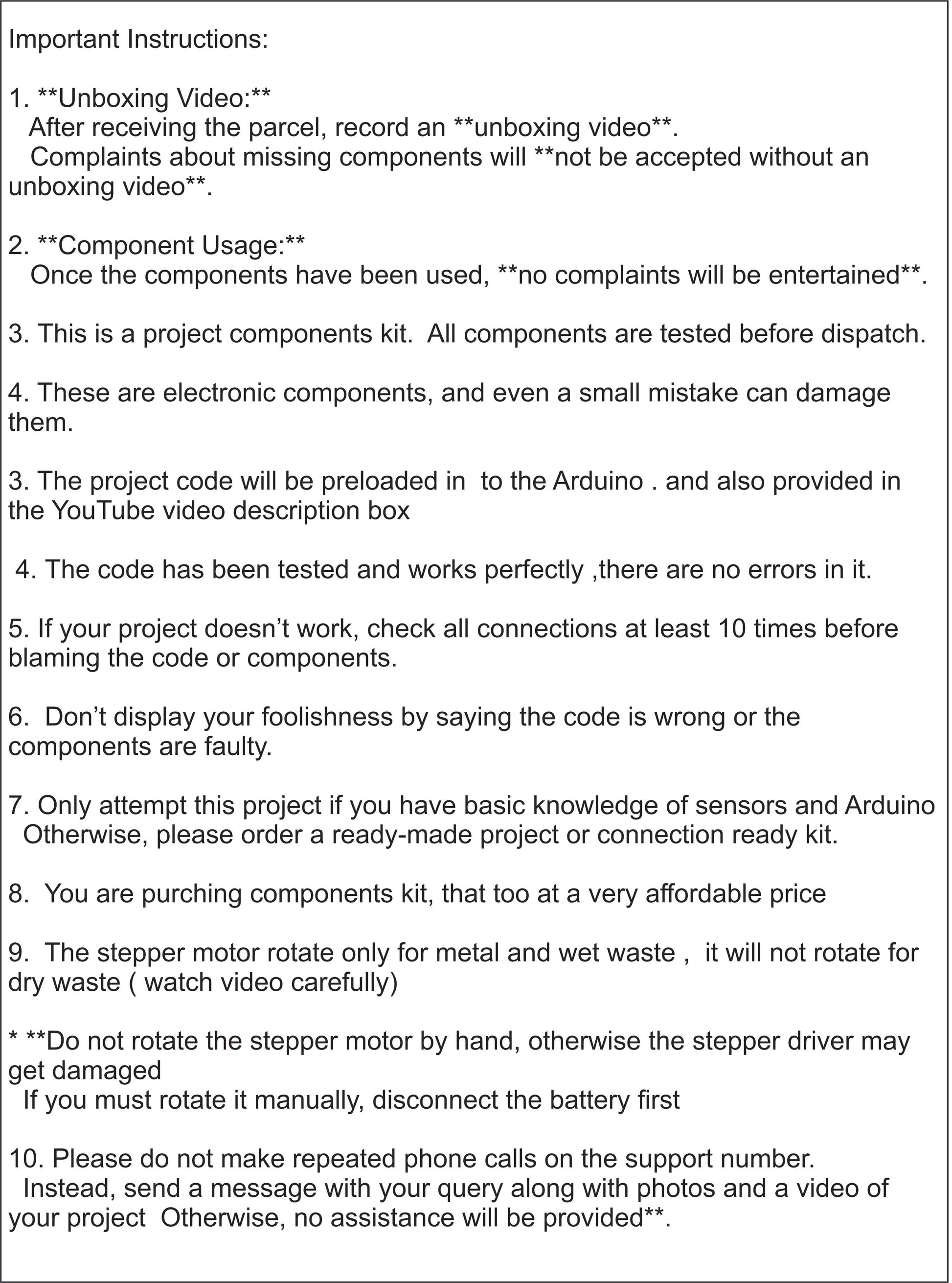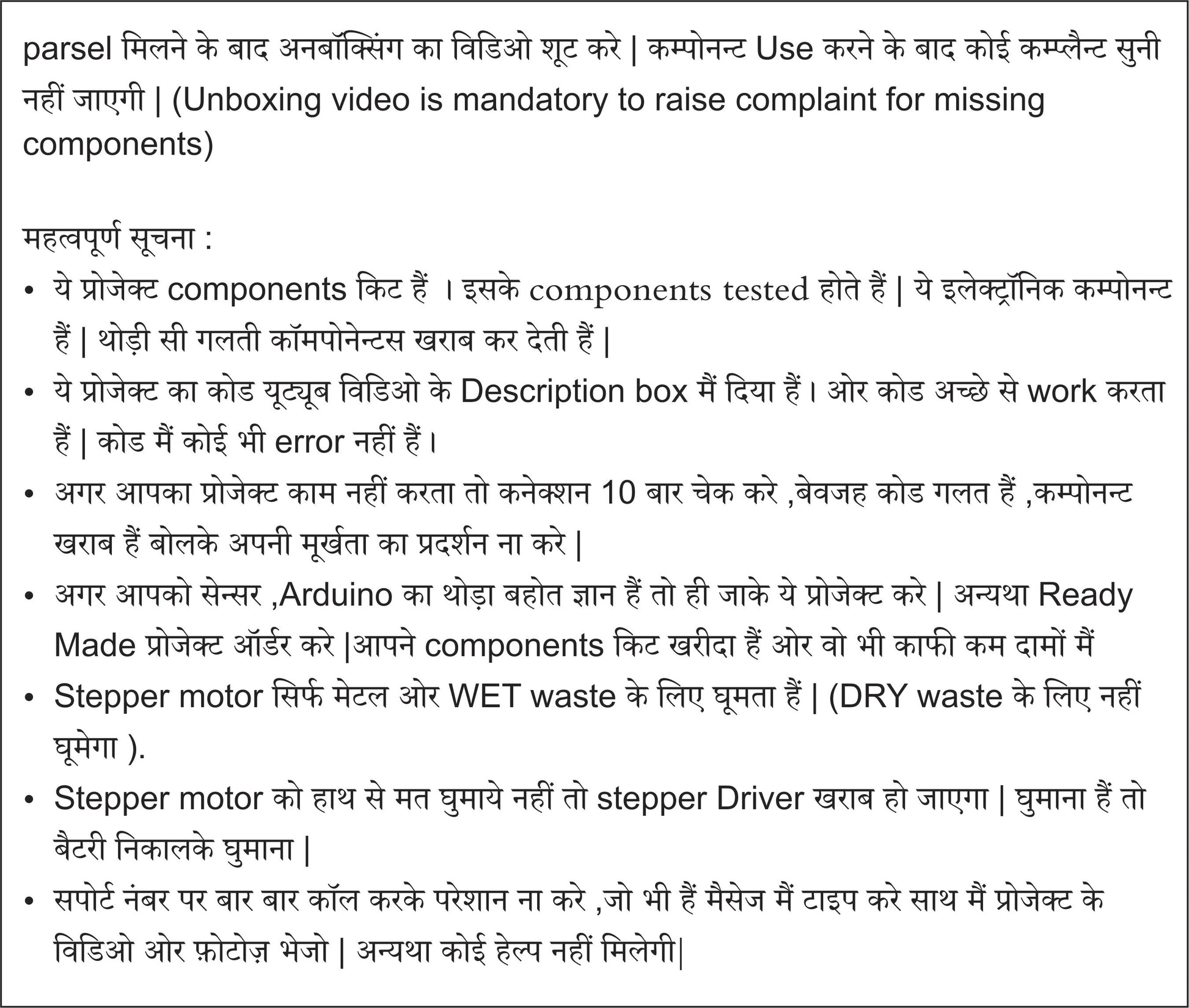 parsel मिलने के बाद अनबॉक्सिंग का विडिओ शूट करे | कम्पोनन्ट Use करने के बाद कोई कम्प्लैन्ट सुनी नहीं जाएगी | (Unboxing video is mandatory to raise complaint for missing components)