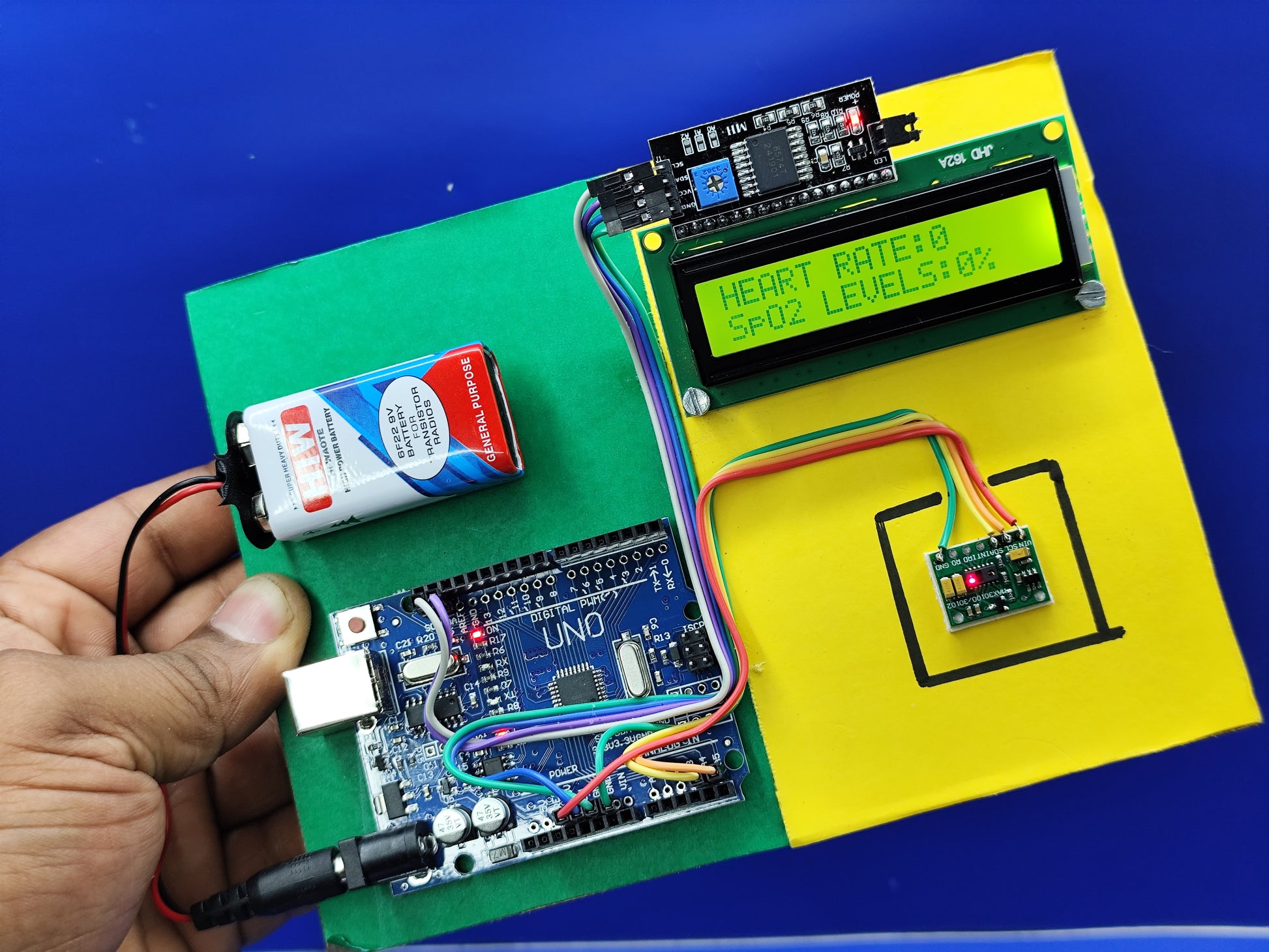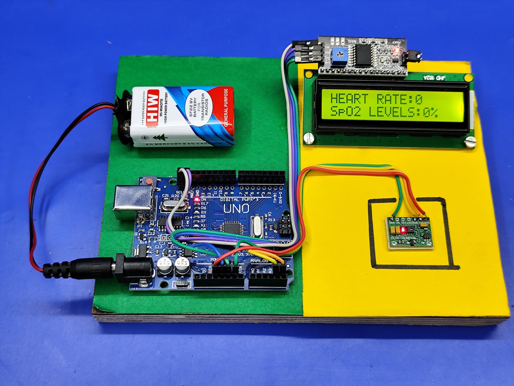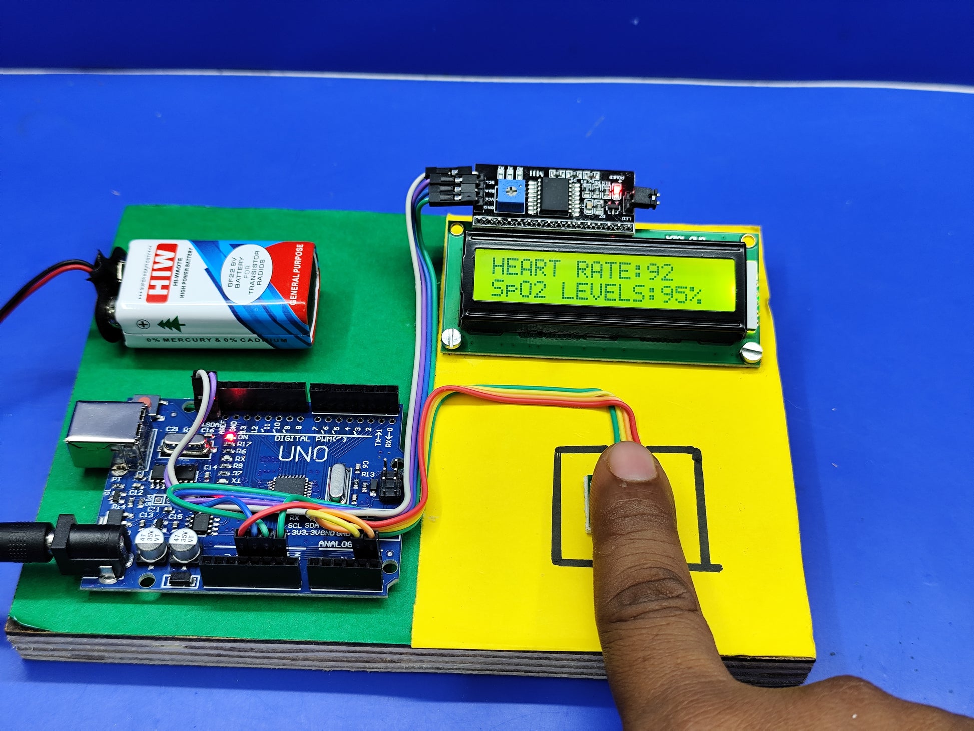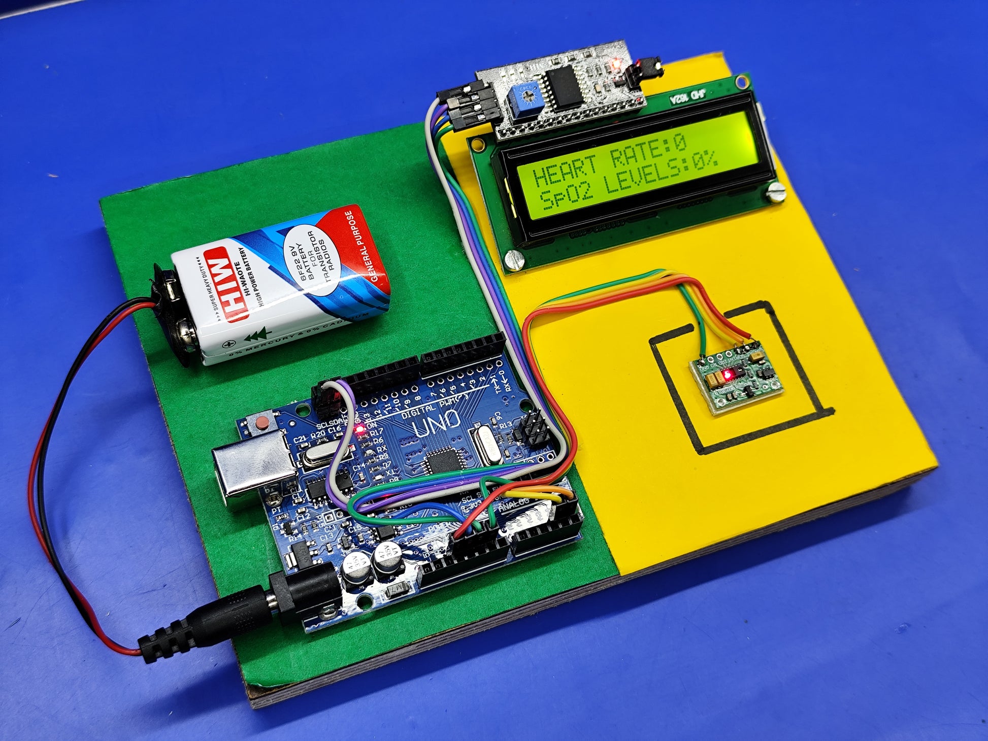 with following components ( Arduino Uno SMD, Heart Rate Pulse Sensor Module, F-F jumper wire,16x2 LCD,i2C interface, 9V battery, 9vBattery snap with DC jack)